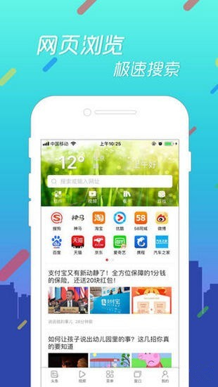 【懂你所想】运用大数据与人工神经网络等技术,根据用户日常浏览内容实时推荐相关内容;更有娱乐、财经、军事等50+以上的频道供你选择。【极速稳定】搜索框能直接输入网址,快捷便利一步到位;基于Chromium与WebKit内核进行深度定制,并采用加速技术使网页打开速度提升30+%。