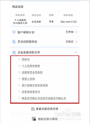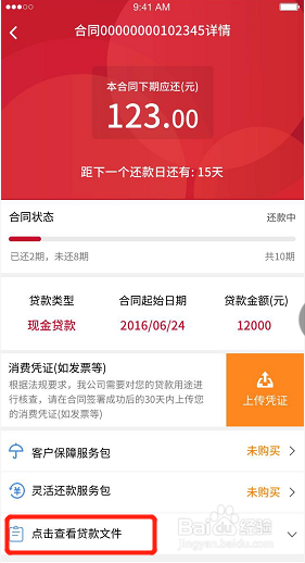 这时候就进入到了,合同界面,点击红框标出的“点击查看贷款文件”(如下图示)这时候我们申请贷款的所有文件都一目了然地呈现在眼前(如下图2示),根据个人实际需求,点击对应文件即可查看具体内容。比如想查看贷款合同条款,只要点击屏幕中的“消费信贷合同条款”即可查看。
