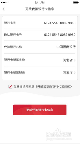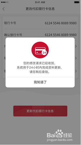 点击自己的对应的银行卡号码和开户行就可以了,点击确认,24小时后就显示更改成功了。
