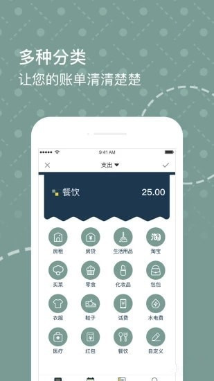 快速记账:一键记账,记账就是这么简单,多种账目分类,让您的账单轻轻楚楚日历查阅:快速查阅每月账单,每日开销明细一清二楚
