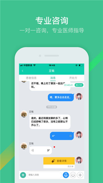 1.在线复诊:提供一对一的医患交流咨询平台,为患者免去排队、挂号等烦恼。2.在线开药:通过线上的复诊报告,医生全程掌握患者的康复状态,及时为患者调整服药种类、次数、剂量等。