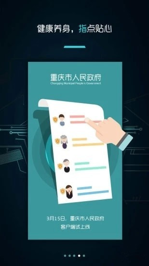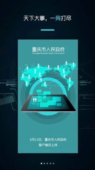 重庆市政府客户端以“专注政务、服务市民”为宗旨,突出天下大事一“网”打尽、财经资讯尽在“掌”握、炫黑科技无“触”不在、健康顾问“指”点服务、招商引资“码”上共赢、数字重庆“云”端共享六大理念。