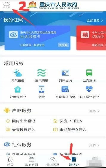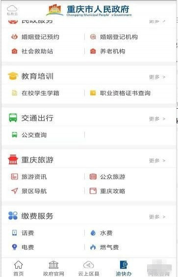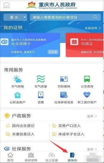 注册登陆后回到渝快办介面,在首页我们可以看到众多业务办理如,查天气,罚款缴纳,公交查询,公积金等等..