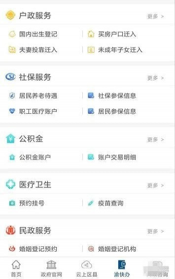 “渝快办”政务服务移动端不仅集合了身份证、社保卡、结婚证、基层法律服务工作者执业证等证照服务,还涉及了公积金、医疗卫生、民生服务等15类与企业、群众生产生活密切相关的高频事项,如社保参保信息、公积金查询和缴费、交通违章查询处理等等。“渝快办”政务服务平台将分布在重庆市58个业务部门、3600多项政务数据资源开放共享、流程优化再造和业务协同统一管理起来,打破各审批服务部门之间封闭运行的行政“壁垒”,实现信息集成、服务集成,为企业和群众办事提供“一站式”掌上咨询、掌上办理、掌上查询、掌上评价的全流程在线服务。同时,平台还开通了在线缴费、邮政快递等服务,从而实现移动政务服务“指尖触达、掌上通办”的目的。