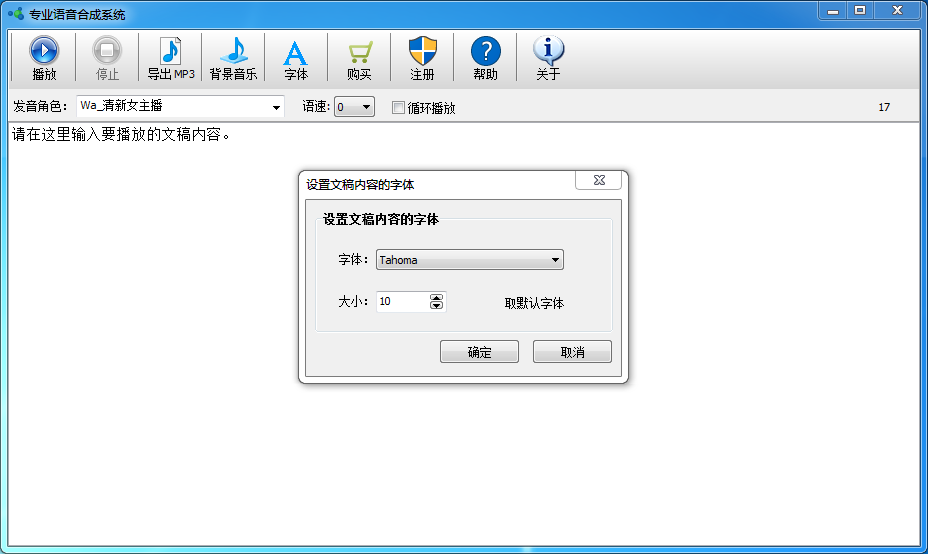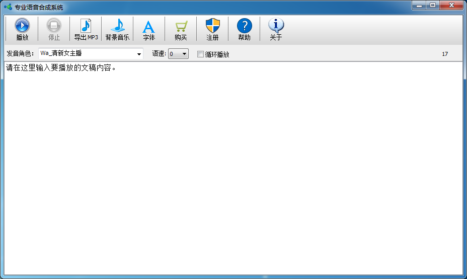 “专业语音合成系统”是最新型的专业播音软件,专为商场、店铺等营业场所而设计,同时具备文字播音和制作语音广告的功能。您只需把播音稿复制到软件,软件就可对您的文字播音稿进行自动循环播音,使用十分方便。如您希望在音响上播放商品促销信息,您可以使用导出MP3的功能,将您的文字播音稿导出成带有背景音乐的语音广告MP3,随后您可以把它任意放到U盘或者手机上播放,自由度非常高。配合拥有独家知识产权的“清新女主播”、“清新男主播”、“儿童女主播”、“魅力男主播”等真人级文字播音员,播音效果媲美专业主持人,并绝无口误,从不疲惫,且不需要您每月支付高额工资。