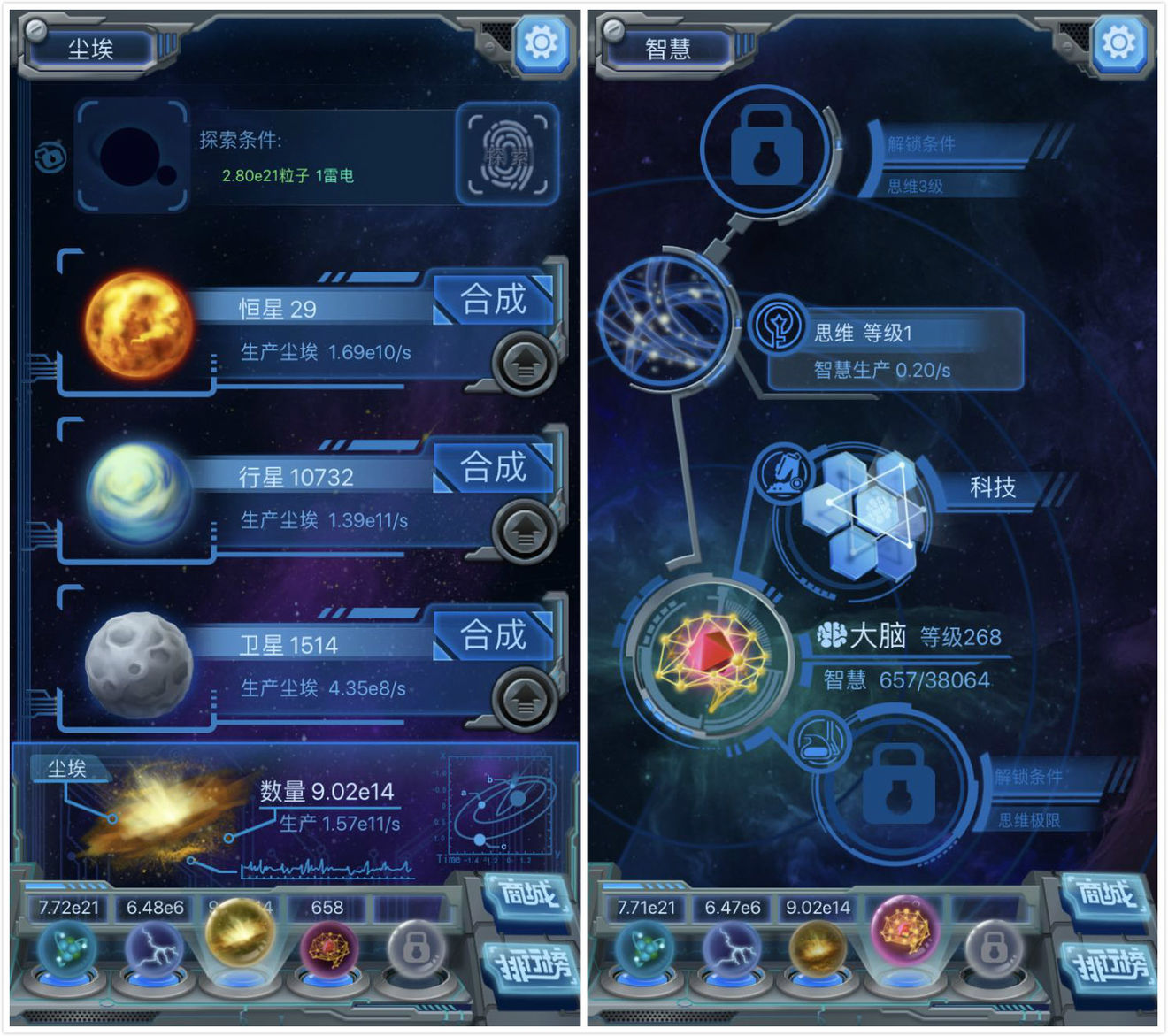 ⑥智慧是游戏中相当贵重的资源,由于产量极低且只能通过时间累积需要合理使用。其作用一是作为大爆炸的唯一需求,二是可以当做货币直接购买粒子、尘埃、雷电。