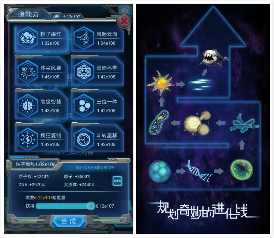 科幻背景下的放置类游戏。作为一名世界的经营者,进化物种,探索星系,发展科学,研发暗能力。物种进化
