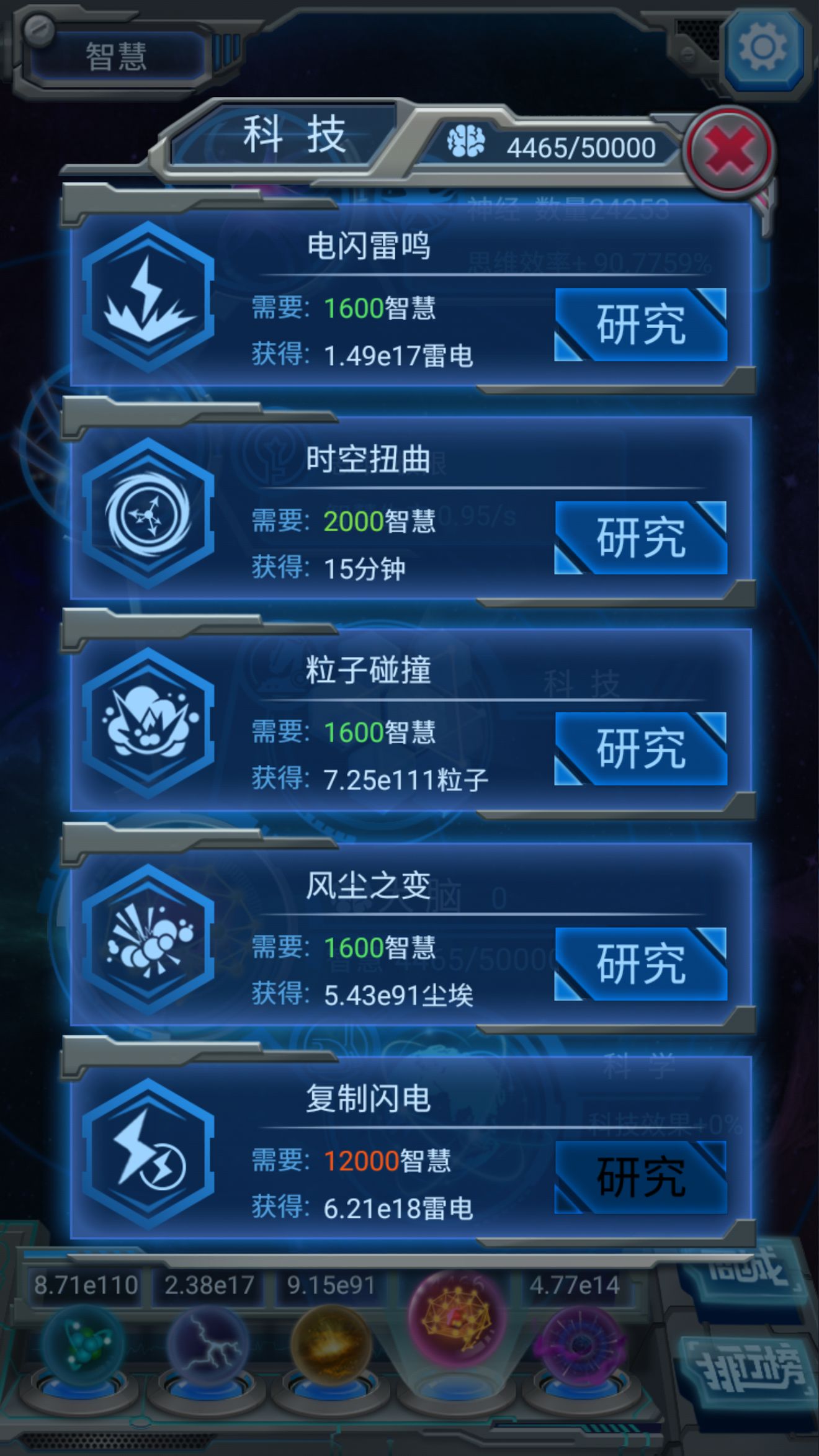 除了高级智慧和暗质转化属必学技能,中期一般有2个方向,一个是走基础路线,专注提高粒子,尘埃,雷电基础产量;另一个是走科技路线,专注学习科技技能,用智慧买大量资源。
