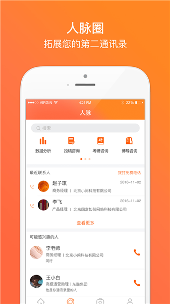 1、数万专业人脉,一键沟通这里活跃着海量专业达人,可以根据姓名、单位、学校、职位、擅长知识等多个维度检索到他们,网络电话一键沟通。