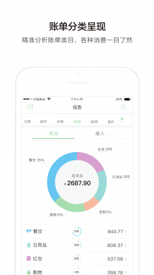 饼图可按记账分类、成员统计——钱从哪里来,钱花哪里去,是谁花的钱,有谁比你更清晰