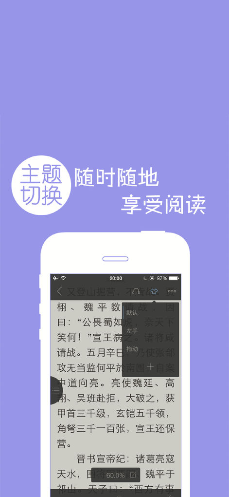 可以根据您的阅读习惯设置多种不同的阅读主题(比如左手操作,被窝主题,地铁主题等),在不同的阅读环境下随时切换最适合的阅读方式。