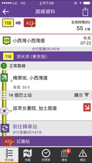 - 快速点对点搜寻路线採用地图式搜寻功能,只需直接于地图上选取起点及终点位置,快速搜寻路线资料,体验真正点对点的方便。又会显示起点或目的地与上车或下车巴士站的步行距离,贴心助您计划行程。