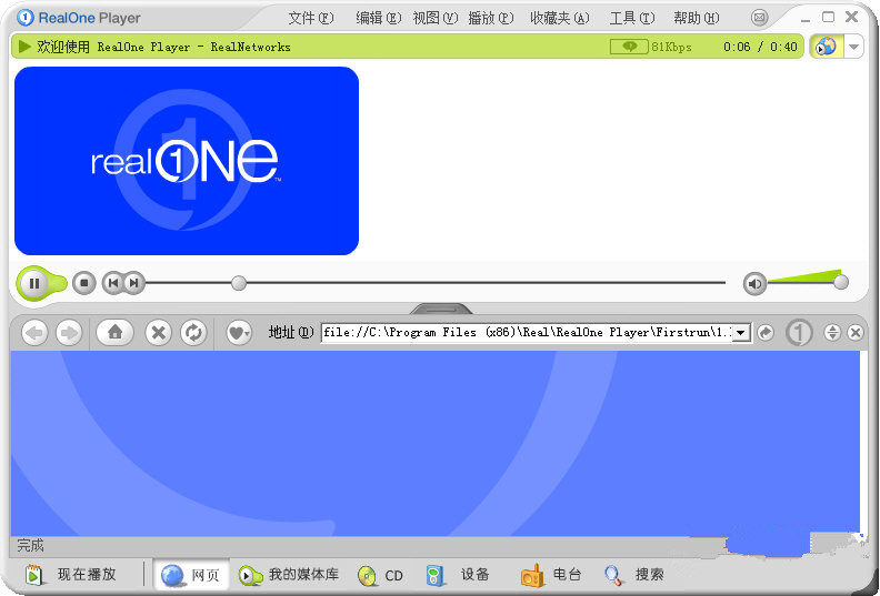 ealNetworks 公司新一代支持媒体格式更多、网络功能更强的播放器,全新的Web浏览、曲库管理和大量内置的线上广播电视频道,不一样的信息中心让您与互联网实现互动,丰富的媒体格式支持让您再也不必安装其它任何媒体播放软件。如今它的制作商RealNetworks,Inc.又推出了新一代支持媒体格式更多、网络功能更强的播放器-RealOne Player!它不再是当初纯粹的播放器,全新的Web浏览、曲库管理和大量内置的线上广播电视频道把一个生动丰富而精彩的互联网世界展现在我们面前,实现网友和互联网络的最亲密接触。不一样的信息中心让您与互联网实现互动,丰富的媒体格式支持让您再也不必安装其它任何媒体播放软件。这就是RealOne,RealPlayer和RealJukebox的结合体,第一流播放软件!