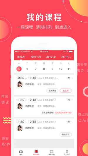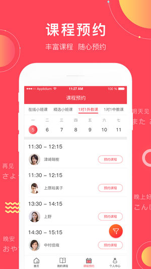 我的课程:一周课程,清晰排列,到点进入课程预约:丰富课程,随心预约