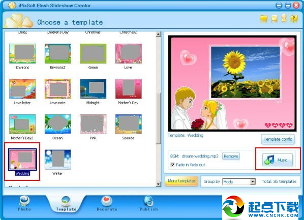 Flash幻灯片创建器提供了59个免费的预设Flash幻灯片模板,用于制作数码相册,缩略图库,flash照片幻灯片,flash横幅等。在这里,我为Flash幻灯片选择“Wedding”模板。