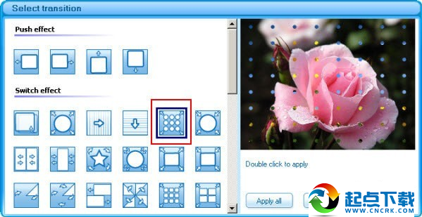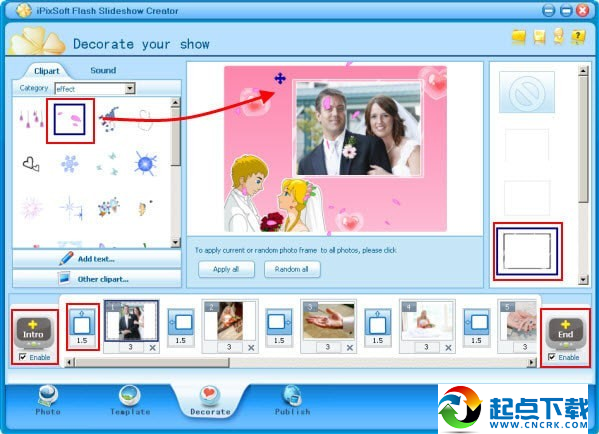 Frist 装饰Flash幻灯片,为闪光幻灯片放映设置“简介和结束”,如果不喜欢,则禁用它们。其次,单击效果框以从70多种过渡效果中选择包括快速和推动效果,以使幻灯片更加生动。您可以选择每个幻灯片效果并设置过渡和照片持续时间,或对所有幻灯片应用相同的过渡效果。然后,为每张幻灯片选择相框或将其应用于所有幻灯片。最后,拖放剪贴板以装饰幻灯片。