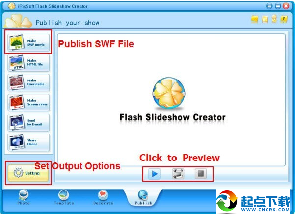 现在我们通过单击“发布”标签转到最后一步。在制作swf文件之前,设置输出选项,如大小,Flash选项,照片选项和循环样式。否则,您可以制作Html文件,可执行文件,屏幕保护程序,通过电子邮件发送或上传以便与Flash幻灯片创建器在线共享。
