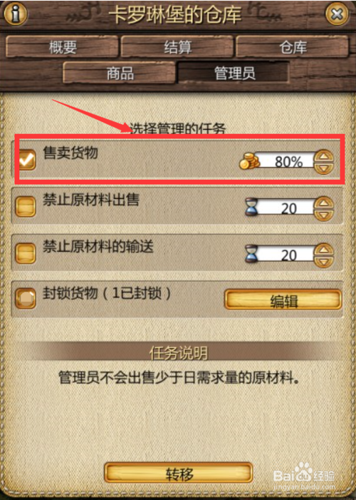 2.勾选售卖货物选择项,价格后面的数值设为80%,相当于80%的价格卖出去。方便的是只要超仓就能卖出,也是为了防止超仓后管理费更贵