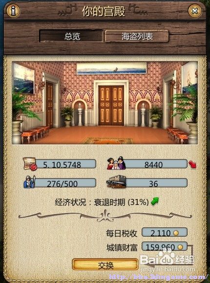 由于人口多消费大需求高,8000人以上时很难提升繁荣度,此时可以关掉城内你的生产设施,人口会立即将到1000以内,此时购买NPC的建筑时价格会下降,同时人口上需求少,你可以派几条船拉些货就能迅速提升到繁荣,然后把生产率慢慢升高到10%~20%,城市人口回升,你的人口比例就超过75%了,就可以接管此城了。