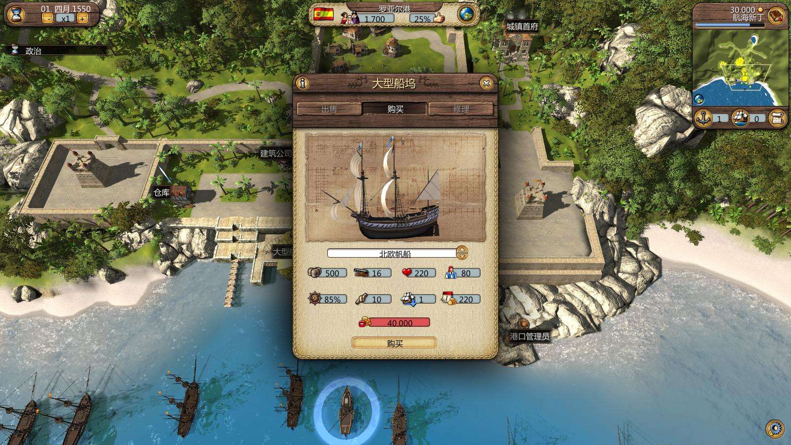 开头英国15个城,就三个城卖船:首都克里特、圣胡安、安得罗普。你可以弄条小船成船队,放在这几个港,这样就能方便的时不时的去这些船厂看看有没有班轮可卖。