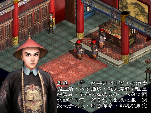 祯在路上遇到了年大人和李卫,年大人已得知八阿哥派杀手来杀祯的事,正在这时,杀手已到。打败杀手后(年可学会“平地一声雷”,在此再到武器店中把装备换上)。祯于是先回自己的府上再说。一回到府中,看见自己的守卫已被杀,八阿哥已带兵来了,就和杀手打了起来。打完后,十四阿哥来了,他叫八阿哥住手,可是八阿哥根本不听。于网络日记是众人又和官兵打了起来,(这几个官兵伤血都还多,我所有人马都29级了,可打起还是有点费力,要用绝招对付)。打完后,八阿哥就走了。