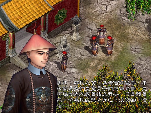 仔细考究的清廷朝服、各式各样的人物表情。不会是只有面对一模一样的一号表情,可以明显得感受到剧中人物的喜、怒、哀、乐,随着游戏角色的心情起伏,而自己的情绪也跟著有所波动。不论是游戏的主角或配角,抑或是敌方的喽啰、头目、乃至于各章节的首领,生动活泼的肢体动作与表情,更能够让玩家融入游戏之中,与游戏中的角色一同创造历史。