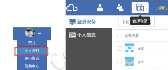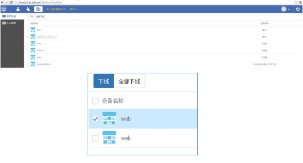 点击导航栏的【管理登录】,选择【登录设备】,会显示当前账户连接到网站的所有设备名称和登录时间,可勾选一条记录进行【下线】或点击【全部下线】把连接设备全部清空。如下图所示: