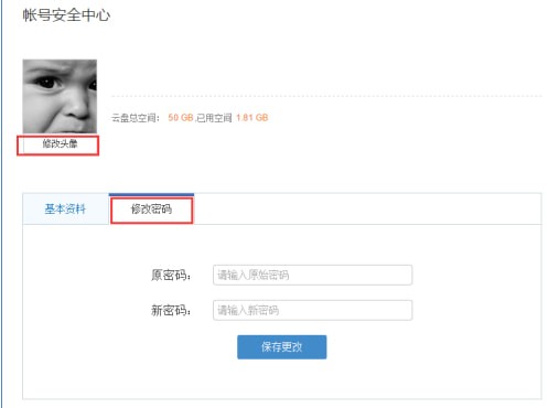 1. 点击页面右上角的头像图标,下拉单的【个人资料】选项,或【管理登录】页面的【个人信息】,可以进入帐号安全中心页面。可以查看当前账户的云盘总空间和已用空间信息,查看用户的基本资料或者修改昵称。如下图所示: