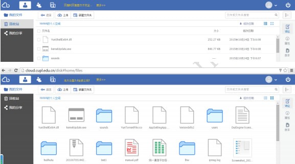 登录系统后进入个人空间或者群组空间,在导航栏选择【切换到列表视图】或【切换到大图视图】切换文件/文件夹的页面展示模式,如下图所示: