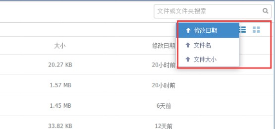 功能描述:云盘网页端的文件浏览提供了两种视图模式,分别为列表模式视图及大图模式视图,方便不同习惯的用户管理查看云盘的文件。能以修改日期、文件名、文件大小三种方式对文件进行显示排序。