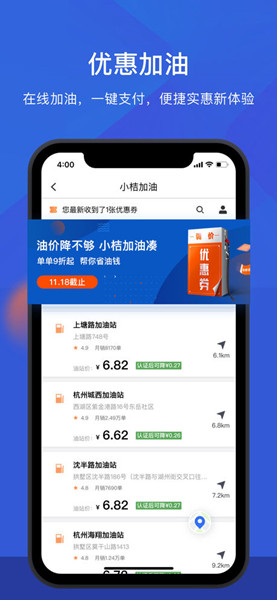 汽车加油优惠,小桔车服app与全国300个城市的4000家油站合作,为车主提供优质便捷的互联网加油服务,与基于油站场景的一站式增值服务;