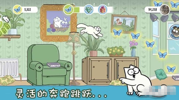 西蒙的猫渴望和他的心上人Chloe约会,但他需要蝴蝶来打动她的芳心,扮演西蒙的猫和他的朋友们,踏上一段无尽的跑酷冒险来追逐蝴蝶!游戏卡通风格,猫猫十分可爱,与跑酷游戏玩法基本一致,点击跳跃、下滑躲避、长按飞跃,穿过花园,在奔跑的同时收集蝴蝶,不过要当心刺猬和老鼠,它们为你设置了陷阱。