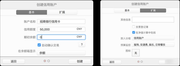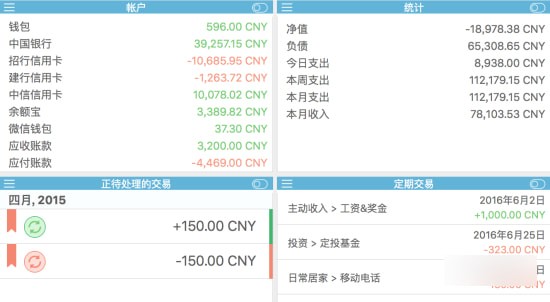 MoneyWiz 可添加的账户类型有:现金账户、储蓄卡账户、信用卡账户和贷款账户等(在线银行账户和 PayPal 只支持国外账户,并且需要用户额外订阅付费才可以使用)。在「控制面板 – 统计」中,MoneyWiz 会自动计算净值和负债,以及当月支出和收入总额。如此,轻轻一瞥,便能直观地了解到目前的资产状况。