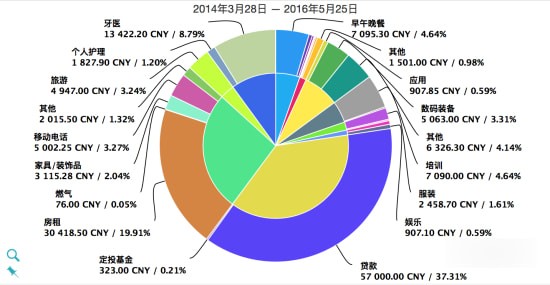 MoneyWiz 按账户、预算、分类、交易对象和其它类型,内置十多款报表样式。您可以选择一个关心的报表类型,直接点击图表,调整账户、分类和期限等数据,最后点击「生成」按钮就可以看到一份详细的的报告,比如: