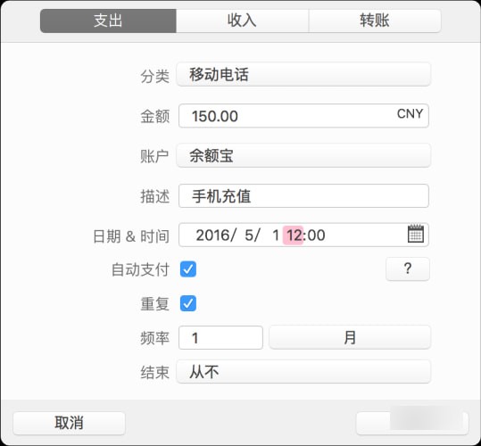 因此,可以在「预定」中新建一条支出:金额为 150,选择账户和分类,设定日期为每月 1 号。勾选「重复」并设定频繁为每月 1 次。