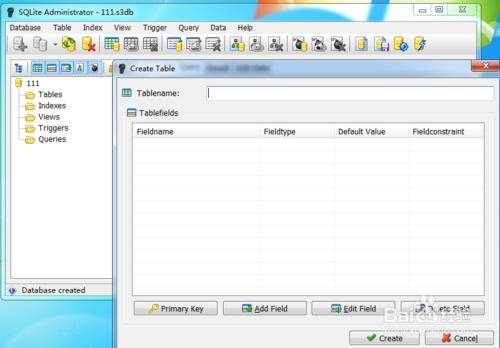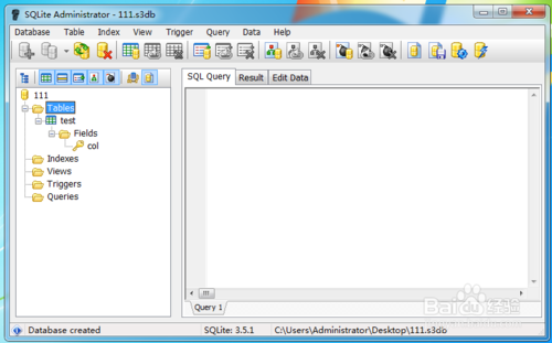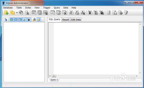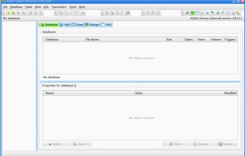 操作sqlite数据库1.运行后,软件界面如下图所示,界面很简单,全英文的软件操作语言,如下图2所示,点击开始新建一个测试用的数据库