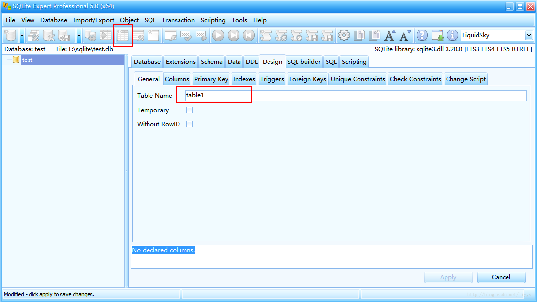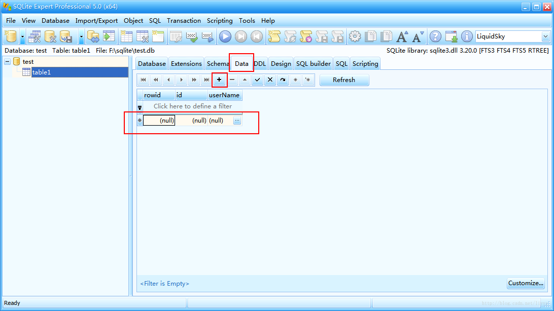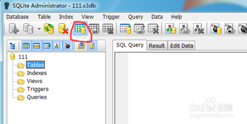 2.然后是创建一个测试用的数据表,如下图所示,点击红色标注的按钮图标,就会弹出表创建的界面