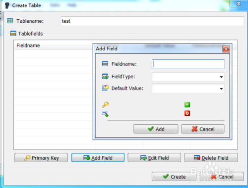 3、点击上方菜单的新增表按钮,然后在 Table Name那里输入表名