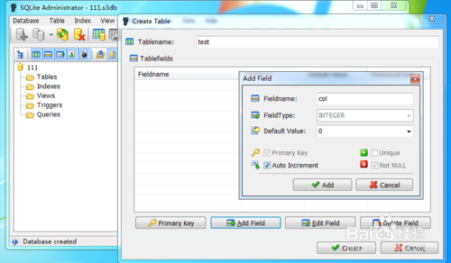 3.添加字段,设置字段的参数类型,主键盘,默认值等一些常用的设置参数,如下图所示,就可以创建一个数据表了