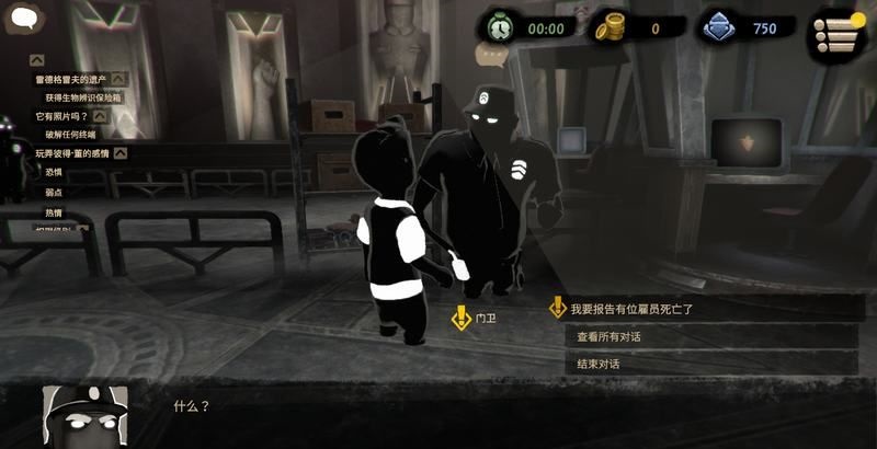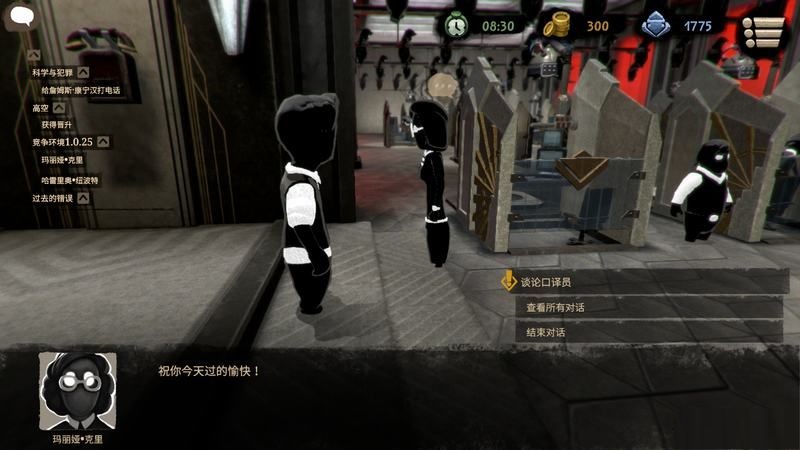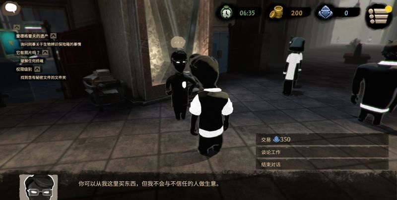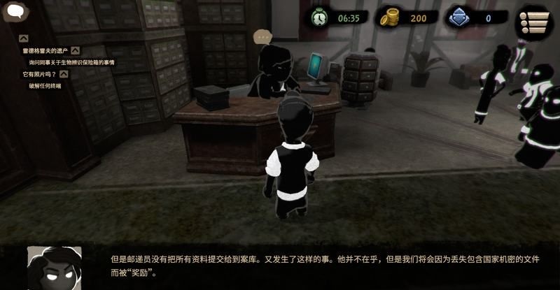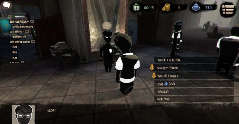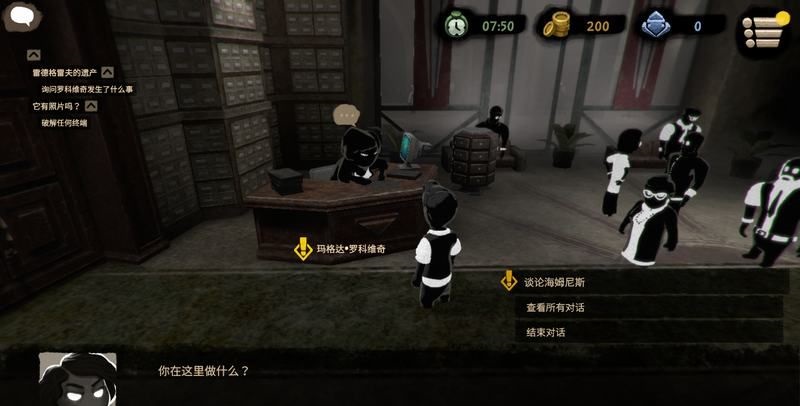 接下来我们需要询问周围的同事来获得关于海姆尼斯的情报了,附近的三个同事+一个邮递员+食堂小贩大妈都可以进行交流获取信息。