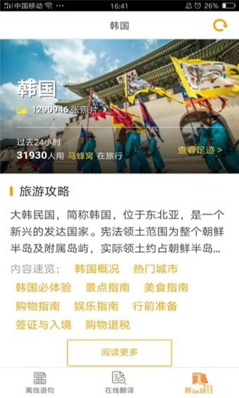 韩语翻译世界app包括韩国旅游中的交通、住宿、购物、景点等基本信息, 还有韩国当地的城市景点、饮食文化、娱乐购物等地道信息, 语句中韩文可见, 点击即可发音, 是你真正的韩语翻译官。