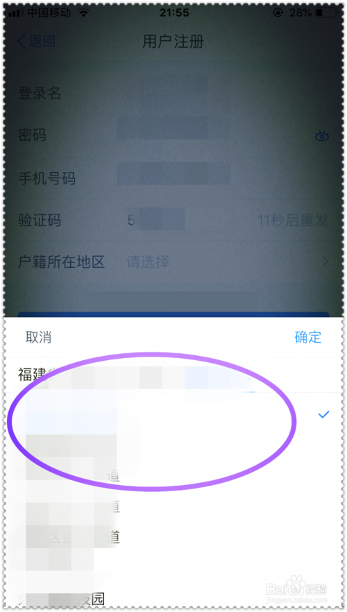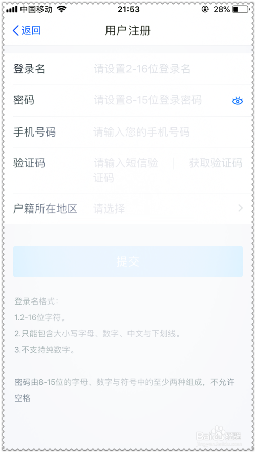 通过后进入注册界面,输入自己要的账户名、登陆密码,手机号码、手机号码验证码等,底部选择户籍所在地。