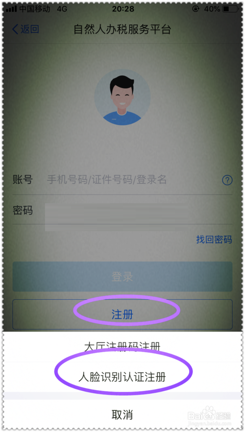 进入主界面,点击右下角个人中心,进入个人界面,点击中间注册,在弹出的界面选择人脸识别认证注册,这个功能适用于身份证注册,如果其它证件,选择大厅注册码注册。