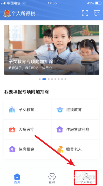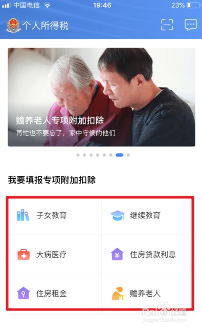 点击进入后,我们登录自己注册的账号,如果没有注册可以参考小编以下的经验。登录后,可以看到主界面的专项附加税扣除的几种分类。