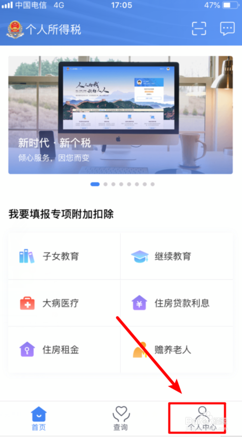 个人所得税APP任职受雇信息不对怎么删除?进入到应用的主界面后,我们登陆个人账号,然后点击下方的个人中心。