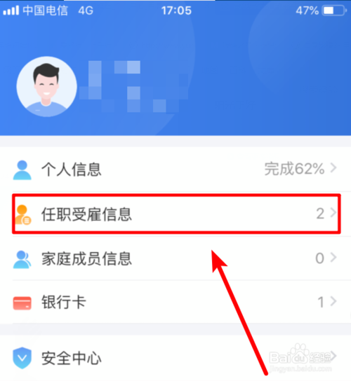 在个人中心界面,可以看到任职受雇信息的选项及公司个数,我们点击进入。