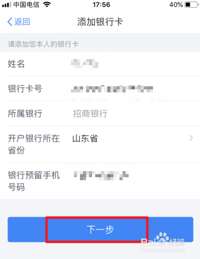 点击进入添加页面,我们输入自己的银行卡卡号及绑定的手机号码,点击下一步。