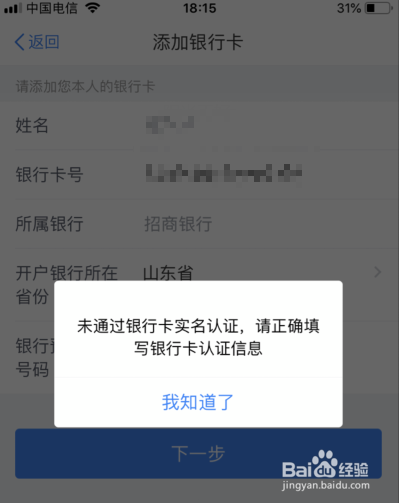 如果界面提示认证失败,那么就是个人信息填写错误,可以检查卡号和绑定的手机号是否正确。