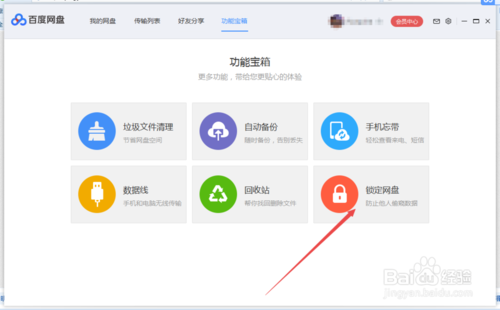 然后会打开一个 功能宝箱 的页面,在这里可以看到一些常用的功能,然后点击 锁定网盘 选项。
