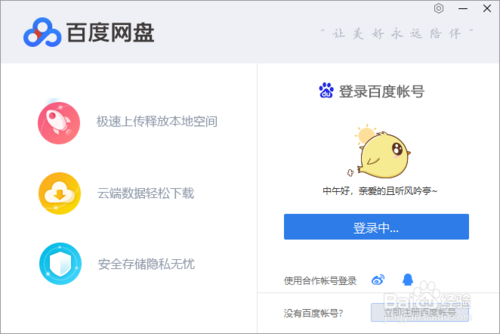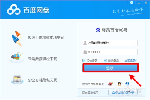 安装完毕后点击百度网盘图标,启动软件。输入对应的百度账号和密码,登录ok。